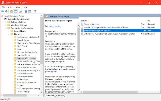 Kemudian ke Computer Configuration > Administrative Templates > network > Lanman Workstation dan Aktifkan "Enable insecure guest logons"